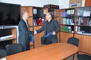 Děkan Přírodovědecké fakulty Jihočeské Univerzity, prof.RNDr. František Vácha, Ph.D. a ředitel Střední odborné školy strojní a elektrotechnické ve Velešíně Ing.Bc. Milan Timko při udělování titulu ‚Fakultní škola Přírodovědecké fakulty Jihočeské Univerzity‘.