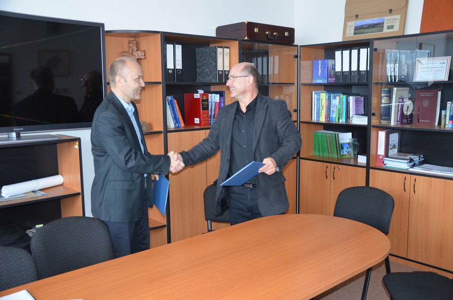 Děkan Přírodovědecké fakulty Jihočeské Univerzity, prof.RNDr. František Vácha, Ph.D. a ředitel Střední odborné školy strojní a elektrotechnické ve Velešíně Ing.Bc. Milan Timko při udělování titulu ‚Fakultní škola Přírodovědecké fakulty Jihočeské Univerzity‘.