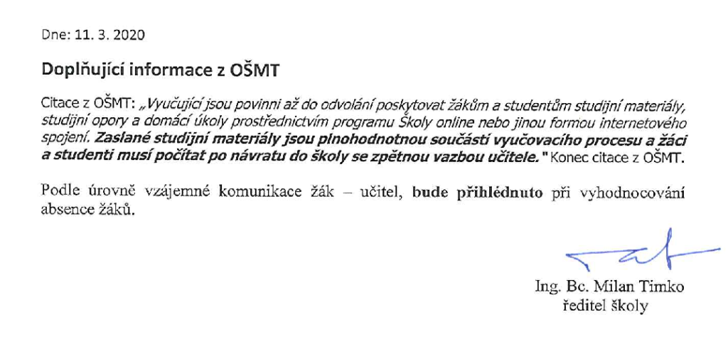 Na základě rozhodnutí vlády ČR o uzavření všech škol ode dne 11.3.2020 se vyhlašuje studijní volno pro všechny žáky naší školy do odvolání. SLEDUJTE prosím pravidelně Školu online, webové stránky školy nebo naši facebookovou stránku.
