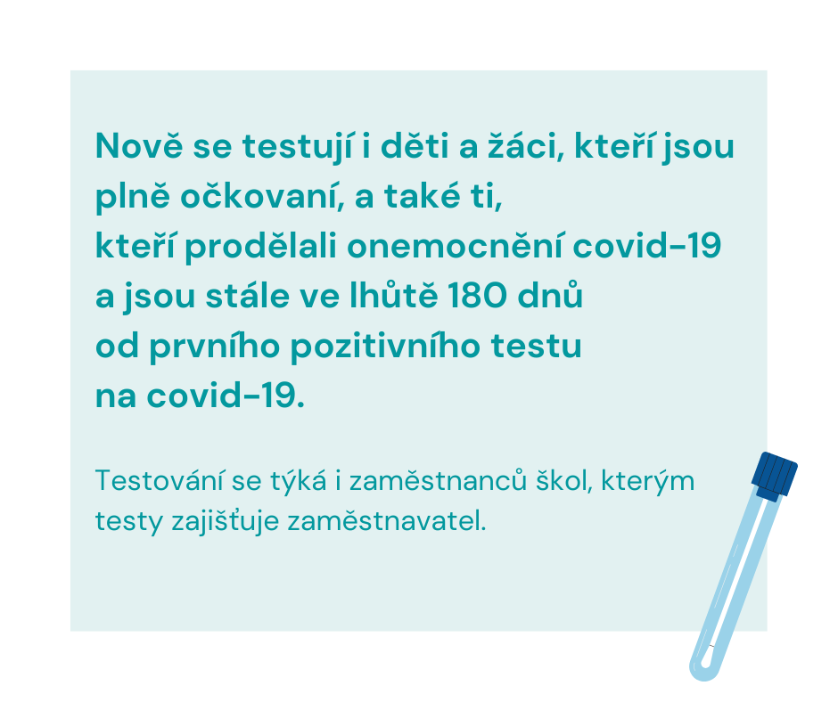 - nově se testují i děti a žáci, kteří mají dokončené očkování nebo jsou v ochranné lhůtě po prodělání nemoci